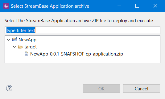 Specify the path to the application archive file to be run or debugged, using the button. The resulting dialog shows the folder path to all StreamBase applications in your Studio workspace. Select the archive of interest and click OK.