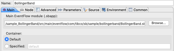 The next EventFlow fragment launch defined by this configuration has a default engine name generated by Studio. The Default setting is appropriate in the great majority of cases. You can see the engine name Studio chooses in the Clusters view at runtime. Select the Engine entry of a started node. The Name entry is near the top of the Properties list.