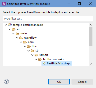 Specifies the path to the EventFlow module file to be run or debugged, using the button. The resulting dialog shows the folder path to all EventFlow modules in your Studio workspace. Select the module of interest and click OK. If your EventFlow project is composed of multiple modules, select the primary module that calls other modules for processing.