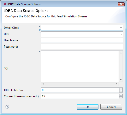 In the JDBC Data Source Options dialog, specify the information required to connect to a JDBC-compliant database, and specify a SQL query that will generate a response from the database to populate the selected input stream.