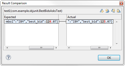 Source folder The sample_bestbidsandasks/src/test/javafolder is entered for you.Package Enter com.example.sbjunit, or use a different Java package name that conforms to your site's standards.Name The name BestBidsAsksTest is entered for you. BBA_test1. This serves as the name for your Java test class and the Java source file to be created.Module under test The file name is entered for you. (If not, use to select it.)BestBidsAsks.sbappTest Method Body All tuples from the Input Streams and Output Streams views. Tuple Maker Class JSONSingleQuotesTupleMaker.