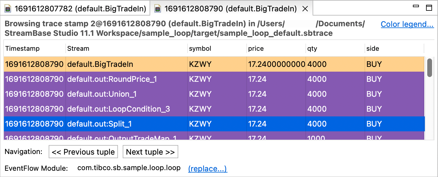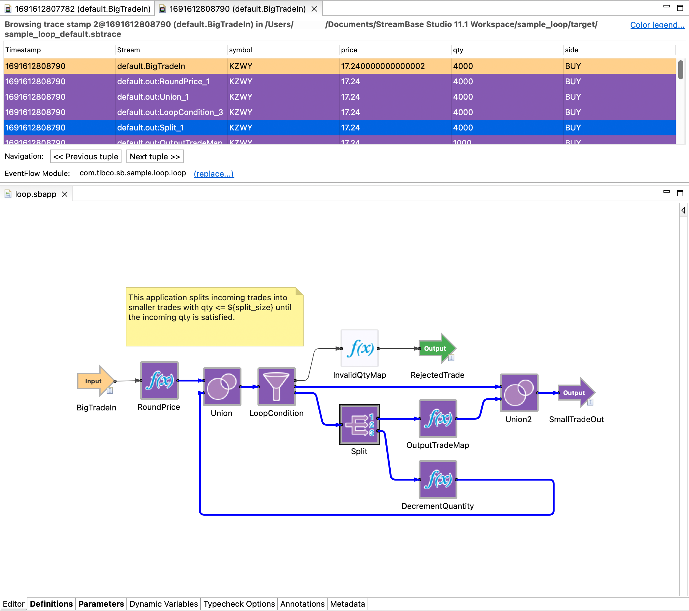 Trace debugging is a way to study an application's behavior offline by stepping through a trace file, line by line. The file contains rows of tuple values in the order they were processed, and shows you how they change, stream by stream. If your application is open in Studio, then when you step through a trace, the location of each line you select in the trace debugger is automatically highlighted in the associated EventFlow module.