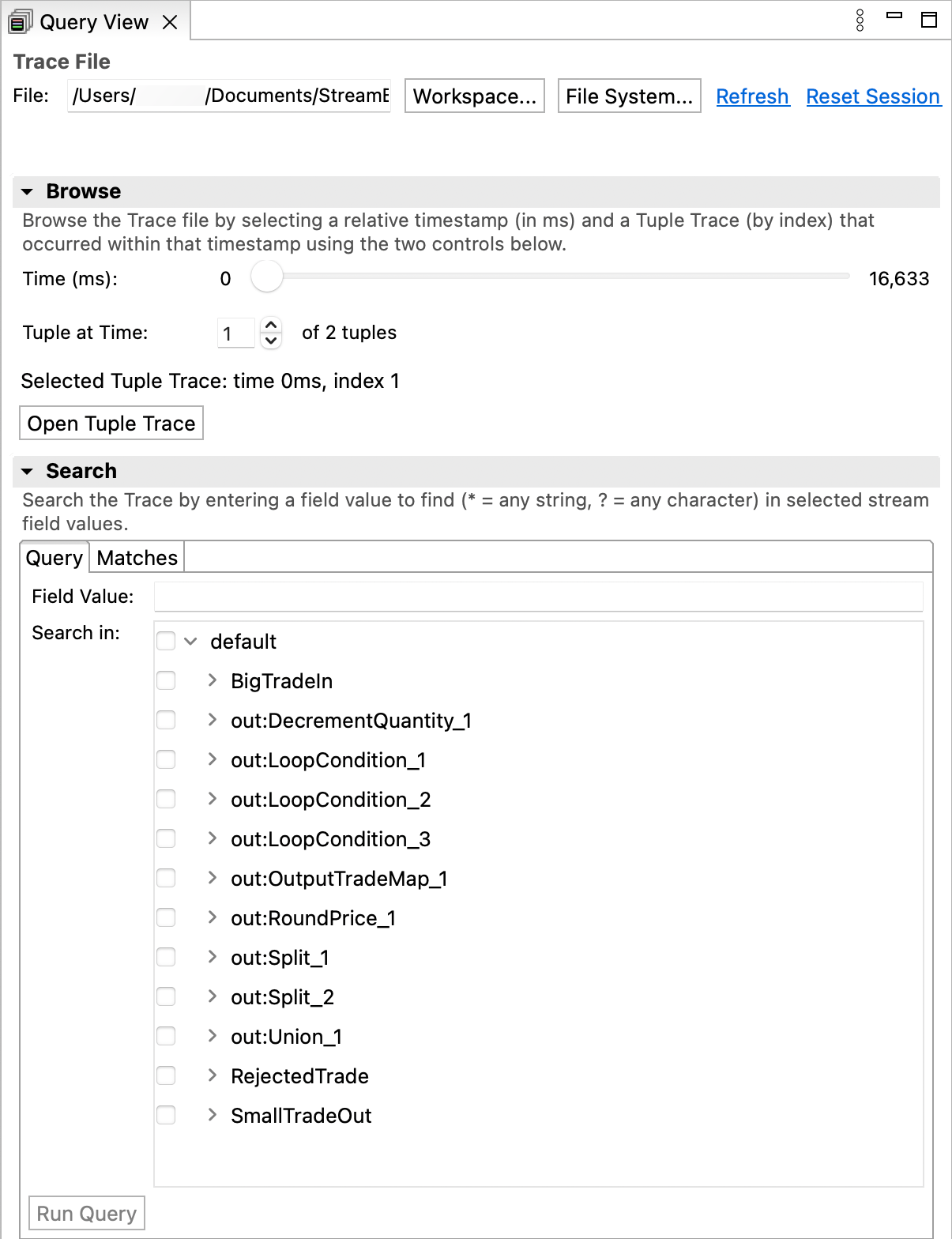 When you open the SB Trace Debugger perspective, you see its Query View with your most recent trace file preloaded. You can select different trace files using either the or the button, reload the current file by clicking , or close the file and remove all trace display window tabs that you have created when tracing by clicking . The Query View is shown in the following illustration: