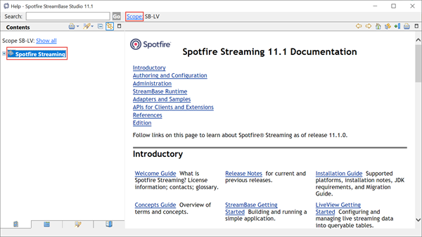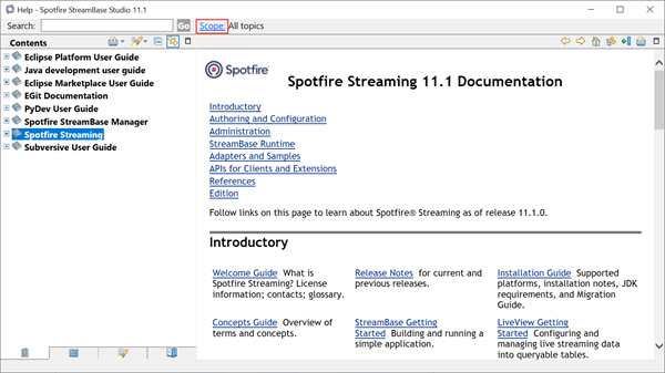 Locally, on systems with Spotfire Streaming installed, as the StreamBase Studio Help system. In StreamBase Studio, open >. This opens a separate Eclipse Help window on Windows and Linux; on macOS, StreamBase Studio help opens in your system's default browser.