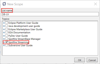In the New Scope dialog list of topics, select Spotfire Streaming and enter a List name to identify this scope.