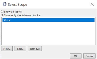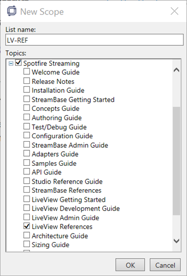 You can set up as many search scopes as you need, giving each a unique name, down to the level of individual books in the documentation set. For example, You can create a search scope limited to LiveView reference pages by opening Spotfire Streaming, selecting LiveView References, and giving the scope a name such as LV-REF, as shown below.