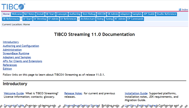 Note that downloaded documentation sets are in website format and thus do not provide a built-in search feature. Use the navigation bar, Site Map, and Topic Index to locate the information of interest (TIBCO® Streaming example shown).