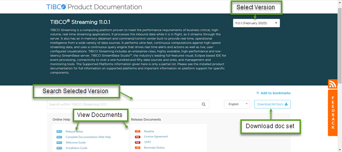 The documentation that you install with StreamBase Studio is available at https://docs.tibco.com. You can browse and search Spotfire Streaming or any TIBCO product documentation there and download it for any currently available version of a product. The following image shows the TIBCO® Streaming documentation landing page and its features.