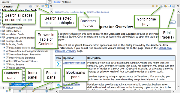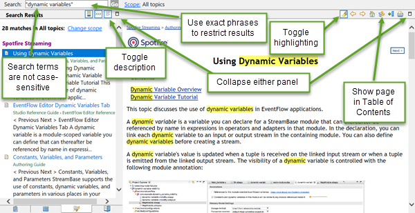 The following figure illustrates the search features of the Eclipse Help versions of Spotfire Streaming Help.